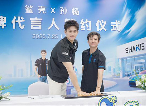 2025年7月25日,北京一家鲨壳授权店内气氛热烈 —— 腾易科技旗下车膜品牌鲨壳与世界泳坛名将、奥运冠军孙杨的续约签约仪式在此举行。腾易科技 COO...